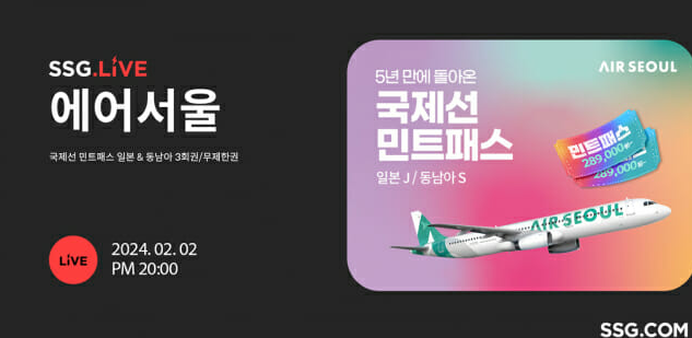 판매는 2월2일 오후 8시부터 자체 라이브커머스 쓱라이브(SSG.LIVE)를 통해서 에어서울 국제선 민트패스 4종을 단독으로 판매합니다.